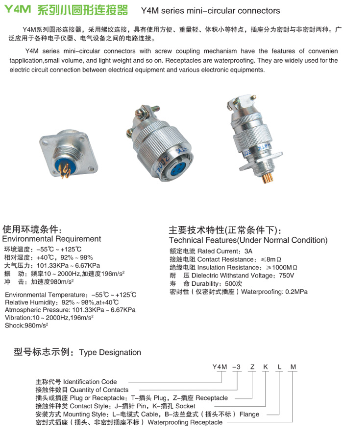 Y4系列小圓形電連接器,體積很小,金屬鋁外殼,重量輕,螺紋連接,插座密封,電連接可靠,使用方便,廣泛應用于各種電子儀器、電氣設備間的電連接。安裝方式有法蘭盤式和電纜式兩種。產(chǎn)品針、孔可以根據(jù)您的要求互換。