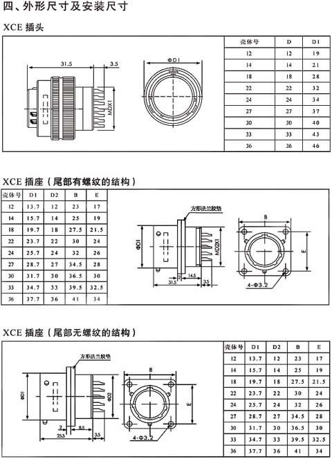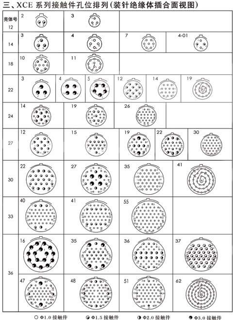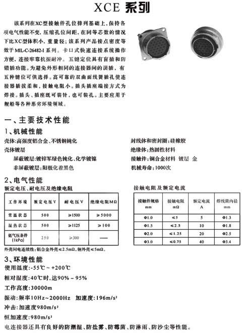XCE系列高密度線簧插孔焊接圓形航空插頭座。適用范圍:航空、航天、艦船等軍事系統(tǒng)國防軍事工程通訊、計算機、儀器儀表領域。、概述:—— 線簧插孔,卡口快速連接—— 五鍵定位具有盲插和防錯插功能—— 為避免外形相同的連接器間的誤插,有五 種鍵位可供選擇,插頭插座端接方式為焊接,插頭、插座既可裝針,也可裝孔——XCE在XC型接點排列基礎上,保持各項 電氣性能不變,壓縮孔位間距,在同等芯 數的情況下比XC型體積小,重量輕,接點排列等效于MIL-C-26482-Ⅰ——XCE系列電連接器突出特點是密度高體積小、重量 輕,接點排列等效于MIL-C-38999-Ⅰ, 接觸件 7~129芯,9種孔位排列,端接方式皆為焊接。環(huán)境性能—— 使用溫度:-55℃~+200℃—— 相對濕度:40℃時,達95%—— 工作高度:30000m—— 振 動:頻率10~2000Hz 加速度196m/s2—— 沖 擊:加速度980m/s2—— 恒加速度:980m/s2 XCE航空插頭座還具有良好的防潮濕、防鹽霧、防霉菌、防淋雨、防沙塵 等性能機械性能—— 殼 體: 高強度鋁合金 屏蔽鍍層:鍍鋅彩虹色或軍綠色鈍化、化學鍍鎳 非屏蔽鍍層: 陽極化著黑色—— 絕 緣 體:熱固性材料—— 封線體和密封圈:硅橡膠—— 接 觸 件: 航空插頭 材 料:銅合金 鍍層:鍍銀、鍍金—— 機械壽命:1000次 .